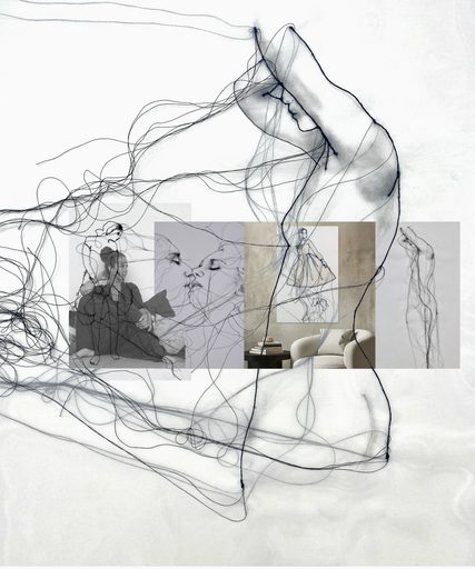 Beelden gaan ontstaan vanuit de zwarte draden, deze zijn machinaal of met de hand aangebracht op doek, de losse draden zijn net zo van betekenis als de vaste draden.