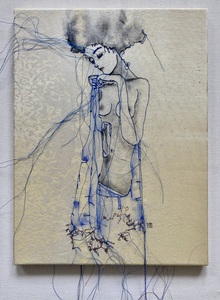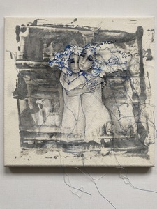 Een figuratief werk van blauw draad, textiel & houtskool op doek op frame.