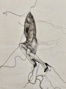 Een figuratief werk van draad, houtskool, acryl & papier op doek op frame.